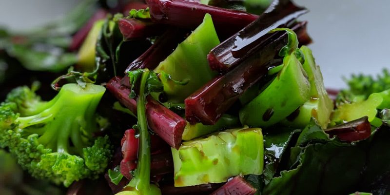 This broccoli and chard salad with balsamic vinegar recipe uses a boiling cooking method. 3 ingredients, no oil, no salt, ideal for light dish or appetizer.