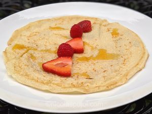I was born and raised in France, and have been making crepes all my life. My traditional recipe, at Laylita.com, uses the classic ingredients. They are delicious and we’ve had so many family and friends breakfasts and brunches with these. Crepes are a social dish. This variation removes dairy, eggs, and some of the fat while keeping an all natural ingredient list. No artificial sweetener.